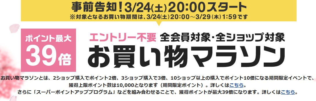 楽天のお買い物マラソンが、3/24(土)20:00~3/29(木)1:59まで開催します!